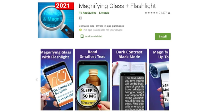 Magnifying Glass हे अँप फोनचा कॅमेरा वापरुन लहान अक्षरे तुम्हाला मोठी करुन दाखवेल जेणें करुन तुम्ही सहज एखादी गोष्ट वाचू शकता. ह्या अँपमध्ये Flashlight सुद्धा मिळते. जेणे करुन तुम्ही अधिक स्पष्टपणे एखादे शब्द पाहू किंवा वाचू शकता.
