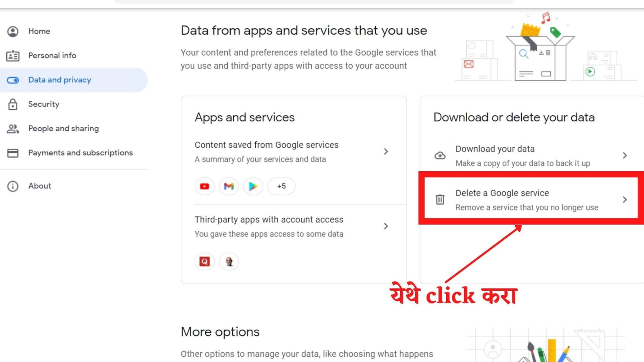 स्टेप ३: तुमच्या समोर एक पेज ओपन होईल तेथे खाली गेल्यानंतर तुम्हाला “Delete a google service” असे ऑपशन दिसेल त्यावर क्लिक करा.
