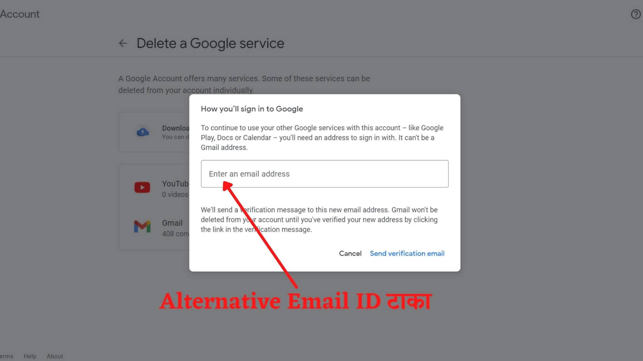 स्टेप ५: त्यानंतर तुमच्या समोर एक पेज येईल जेथे तुम्हाला Alternative ई-मेल आयडी टाकावा लागेल. (येथे तुम्हाला तो ई-मेल आयडी टाकायचा आहे जो तुम्ही वापरत आहात किंवा जो तुमच्या कंट्रोलमध्ये आहे.)